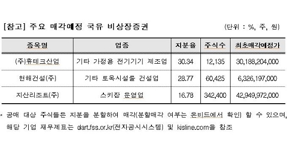 이번 비상장증권 매각 입찰은 매각예정가의 100%를 시작으로 총 네 차례에 걸쳐 진행된다. 2회 유찰된 종목의 경우 3회부터 매회 최초 매각예정가의 10%씩 단계적으로 줄여 입찰이 진행된다.