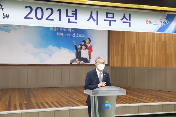 경남도교육청은 4일 오전 본청 강당에서 2021년 시무식을 갖고, 경남교육 대전환에 앞장설 것을 다짐했다.