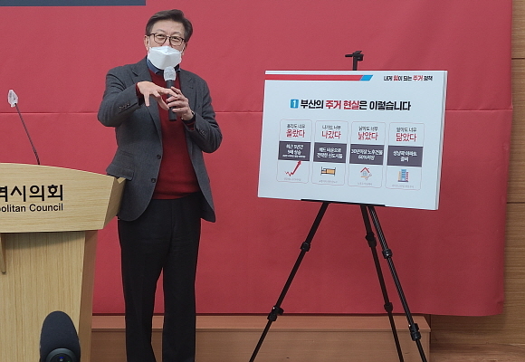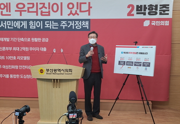 이날 부산시장 예비후보 정책 발표에서 박형준 후보는 ‘맞춤형 주거 사다리 정책’을 제시했다. 박 예비후보는 “부산의 주거 현실은 과도한 집값 상승으로 청년이나 신혼부부가 이른바 ‘영끌’해도 아파트 한 채 장만하기 어렵다”며 “30년이 넘은 노후건물은 60%가 넘을 정도로 열악한 상태”라고 지적했다.
