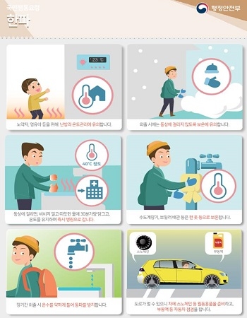 때문에 지역 취약계층인 노약자나 노숙인들에 한랭 질환도 우려되는 상황이다. 또 가정에서는 계량기와 수도관의 동파나 보일러 파손, 정전 등과 같은 시설물 피해와 겨울철 농작물, 양식장 등 냉해도 주의가 요구된다.