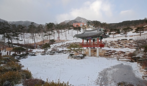 한파주의보가 발령되는 등 매서운 추위를 보인 7일 오전 산청군 동의보감촌에 눈이 내려 진풍경을 연출하고 있다. (사진=산청군 제공)
