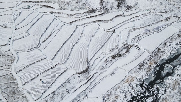 7일 경남 함양군 마천면 도마마을 다랭이 논에서 밤사이 내린 눈이 쌓여 하얗게 변해 있다. (사진=함양군 제공)