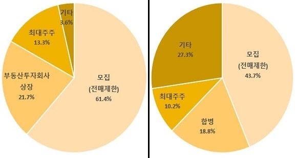 의무보유 주식 설정 사유로는 유가증권시장의 경우 ‘모집(전매제한)’이 5억 5670만주로 61.4%의 비중으로 가장 많았으며 이어 ‘부동산 투자회사 상장’이 1억 9740만주(21.7%)를 기록했다.