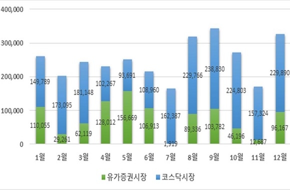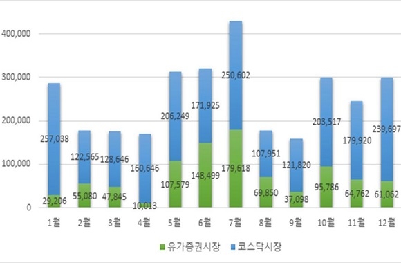 시장별로는 유가증권시장의 의무보유 해제 수량이 9억 4311만주로 전년대비 7.7% 늘어났으며 코스닥시장의 겨우 20억 5195만주로 31.8% 늘어났다.