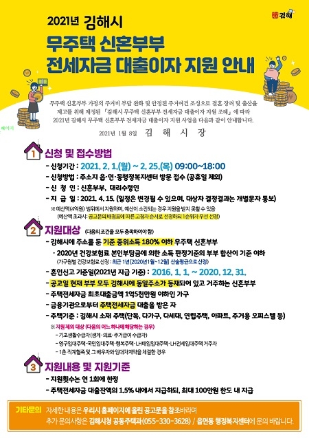 시 관계자는 “무주택 신혼부부 전세자금 대출이자 지원 사업을 지속적으로 추진하여 신혼부부들이 결혼해서 살기 좋은 희망 복지도시 김해가 될 수 있도록 주거복지 사업 추진에 최선을 다하겠다”고 말했다.