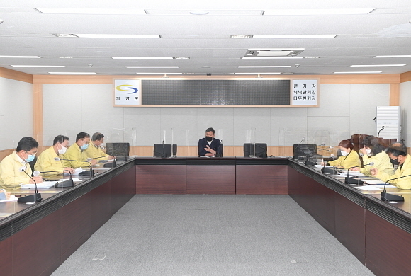 부산 기장군이 지난 10일 군청 브리핑실에서 코로나19 일일상황보고회를 연 가운데 오규석 군수가 “백신 접종 전까진 마스크가 유일한 방역무기”라며 방역 태세를 강조했다.