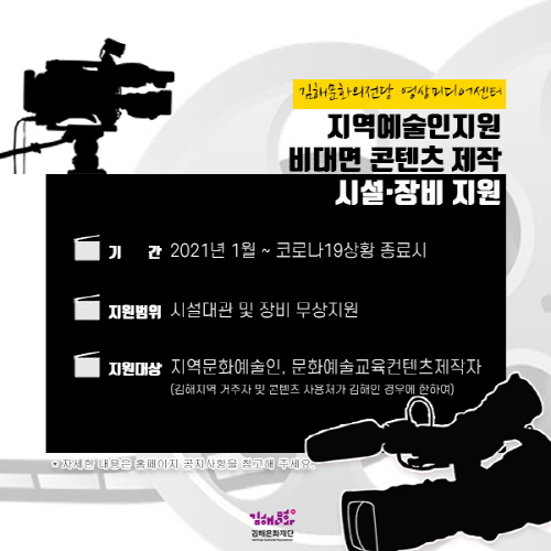 지원 가능한 품목은 디지털캠코더, 조명 장비, 촬영 공간 등으로 영상미디어센터의 전 시스템이 해당한다. 지원 대상은 김해에 거주하는 문화 예술인, 김해를 대상으로 콘텐츠를 사용할 예정인 문화예술교육 콘텐츠 제작자다. 개인의 영리목적, 상업성, 정치 혹은 종교적인 목적이 있는 경우 지원 대상에서 제외된다.