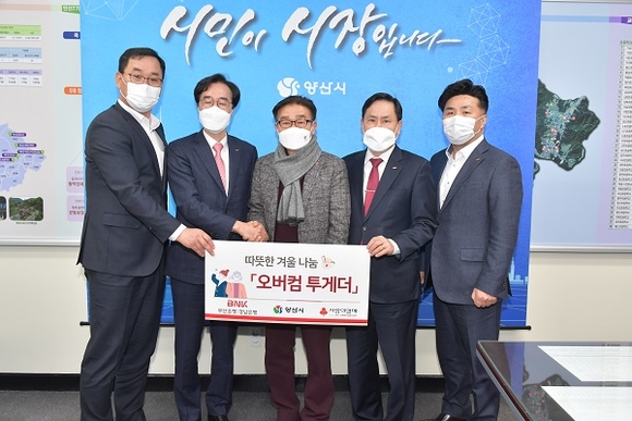 BNK금융그룹 희망나눔재단은 지난 8일 따뜻한 겨울나기 '오버컴 투게더'(함께 극복하자) 생필품 240박스(1200만원 상당)를 양산시에 전달했다.