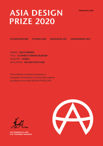 김해문화재단 클레이아크김해미술관 건축물이 ‘2020 아시아 디자인 프라이즈(2020 Asia Design Prize)’에서 금상(Gold Winner)을 수상했다.