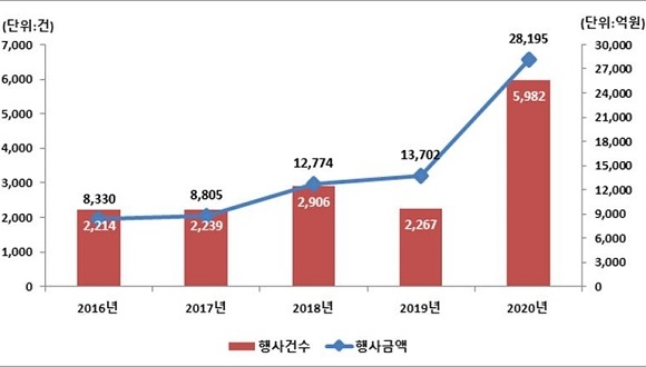 조사결과, 지난해 행사건수는 전년대비 163.9%(3625건) 늘어났으며 금액은 전년대비 105.8%(1조 4493억원) 증가한 것으로 집계됐다.