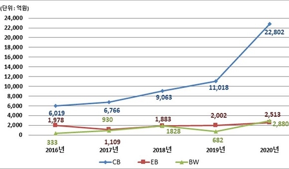 또 금액을 살펴보면 CB는 2조 2802억원으로 전년대비 107.0%(1조 1784억원) 늘어났으며 EB는 2513억원으로 전년대비 25.5%(511억원) 증가했다. 또 BW는 2880억원으로 전년대비 322.3%(2198억원) 늘었다.