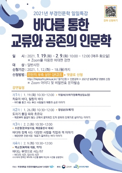 부경대학교가 19일부터 2021년 부경인문학 일일특강 ‘바다를 통한 교류와 공존의 인문학’을 개최한다. 시민들을 위해 무료로 마련한 이 프로그램은 다양한 분야 전문가들이 인문학의 시각으로 바라본 바다 이야기를 제공하는 강연이다.