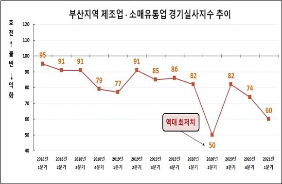 부산상공회의소(부산상의)는 ‘2021년도 1분기 부산지역 소매유통업 경기전망지수(RBSI) 추이’ 전망 자료를 14일 발표했다.