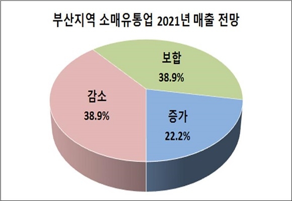 이에 더해 부산상의는 부산 대표 소매유통업체 36곳을 선정해 ‘2021 매출 전망 조사’를 시행했다. 조사 결과 응답업체의 77.8%가 올해 매출 전망을 지난해와 비슷하거나 되려 더 감소할 것으로 예상했으며 단 22.2% 업체만이 매출 증가를 기대하고 있는 것으로 나타났다.