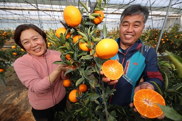 14일 산청군 단성면 김오태(56), 이상희(55) 부부 농가에서 천혜향과 레드향 수확이 한창이다. 산청군농업기술센터가 기후변화에 대응, 지역 맞춤형 신소득작물로 보급한 천혜향은 평균 당도가 14~15 브릭스 수준인데, 후숙을 하면 18~19 브릭스까지 올라 고품질 사과나 오렌지보다 뛰어난 당도를 자랑한다. (사진=산청군 제공)