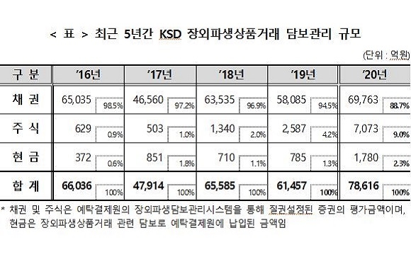 장외파생상품거래 담보로는 채권, 상장주식, 현금 등이 사용되며 전체 담보 가운데 채권이 6조 9763억원으로 대부분인 88.7%를 차지했다. 그 외 상장주식이 7073억원으로 9.0%, 현금은 1780억원으로 2.3%의 비중을 나타냈다.