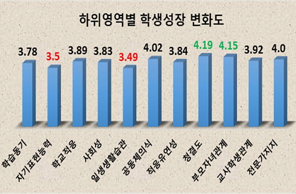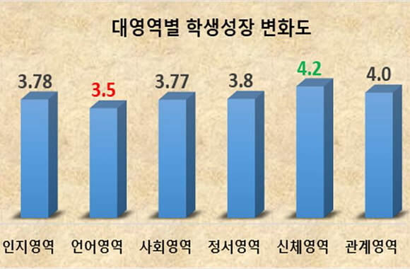 분석 조사의 일환으로 시교육청은 지난해 6월 ‘학생 성장변화도’에 대한 설문조사를 시행했다. 초등학생은 6가지 대영역에 13개 하위영역 총 58개 문항을, 중학생은 6가지 대영역에 15개 하위영역 총 63개 문항으로 각각 시행했다.