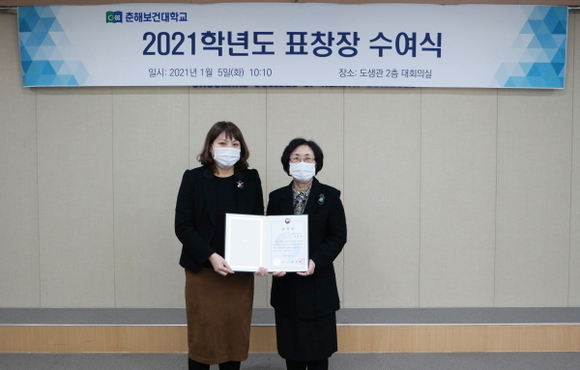 (왼쪽부터) 곽윤향 주임, 김희진 총장이 5일 열린 표창작 수여식에서 기념촬영을 하고 있다. (사진=춘해보건대 제공)