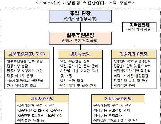먼저 시행총괄팀은 접종 시행 계획 수립 등 사업을 총괄하며 대상자관리팀은 접종 대상자 선정과 관리 업무를 맡는다. 또 백신 수급팀은 백신 수요량 등 수급 상황을 관리하고 접종기관 운영팀은 접종센터와 위탁 의료기관 지정 역할을 수행하며 이상반응 관리팀은 반응 모니터링, 역학조사, 피해보상 등을 한다.
