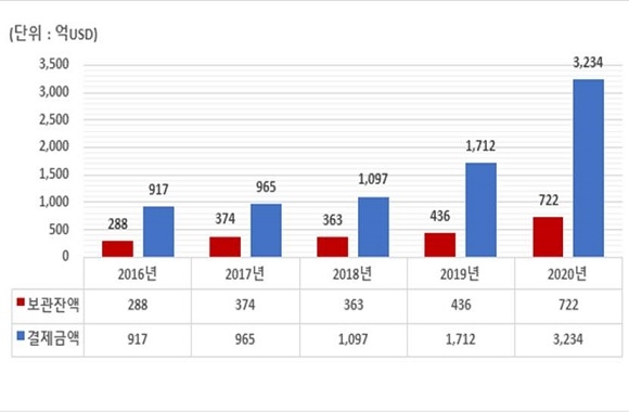 예탁결제원은 ‘2020 외화증권 보관·결제금액 현황조사’ 결과를 21일 발표하고 지난해 결제금액은 3233억 9000만 달러, 보관금액은 722억 2000만 달러를 기록했다고 밝혔다.