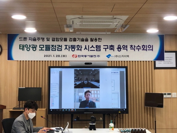 한국동서발전은 디지털기술융합원에서 ㈜스카이텍과 ‘태양광 모듈 점검 자동화 시스템 구축 용역’ 착수회의(비대면 영상회의)를 개최했다고 21일 밝혔다.
