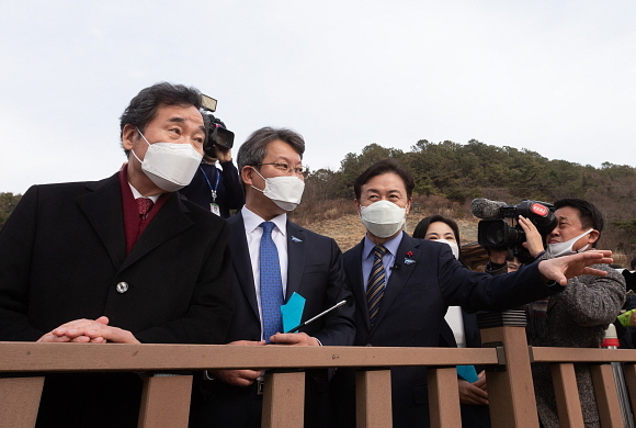 부산시장 보궐선거가 세 달도 채 남지 않은 가운데 여당 유력 후보인 김영춘 부산시장 예비후보(더불어민주당)이 21일 민주당 이낙연 대표 등과 함께 가덕신공항 부지 현장을 시찰했다.