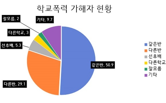 가해자와의 관계는 같은 학교 같은 반 학생이 50.9%로 비중이 가장 컸으며 같은 학교 다른 학년 다른 반 학생은 29.1%, 같은 학교 다른 학년 학생 5.3%로 같은 학교 비율은 85.3%였다. 이외에는 다른 학교 학생이 3%, 잘 모르는 사람 2%, 기타 9.7%로 확인된다.