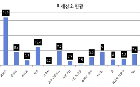 학교폭력 피해 장소는 교실 안이 31.9%로 가장 응답률이 높았으며 복도 12.4%, 교내 다른 장소 9.6%, 운동장 8.9%, 화장실 3.3%, 기숙사 0.2% 등으로 66.3%가 교내에서 발생했다. 학교 외부 장소에서 발생한 건은 사이버 공간이 9%로 가장 많았으며 놀이터·골목 5.5%, 학교 밖 체험장 4.3%, 집 4%, 학원 주변 2.9%, PC방·노래방 0.5%, 기타 7.4% 등이다.