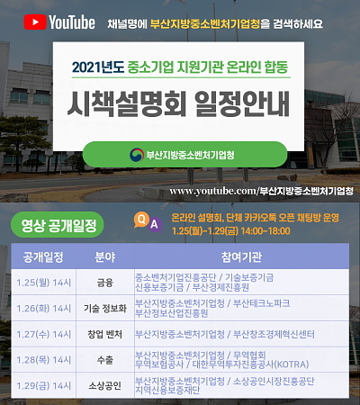온라인 설명회는 유튜브 부산지방중소벤처기업청 공식 채널로 생중계 진행되며 방송 세부일정도 함께 확인할 수 있다.