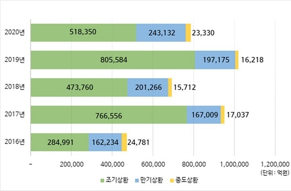 상환된 ELS는 전체의 66.0%(51조 8000억원) 정도가 조기상환으로 가장 비중이 컸다. 이어 만기상환이 31.0%(24조 3000억원), 중도상환이 3.0%(2조 3000억원) 순으로 많았다.