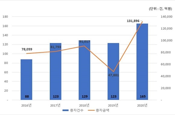 또한 지난해 무상증자발행 규모는 총 165건, 13조 1896억원으로 건수는 34.1% 늘었으며 금액은 175.5% 늘어났다.