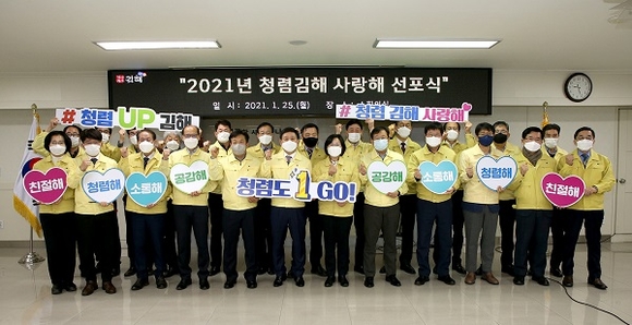 경남 김해시는 25일 허성곤 시장 및 간부공무원과 함께 새해 청렴결의의 힘찬 출발을 위한 '2021 청렴김해 사랑해 선포식'을 가졌다.