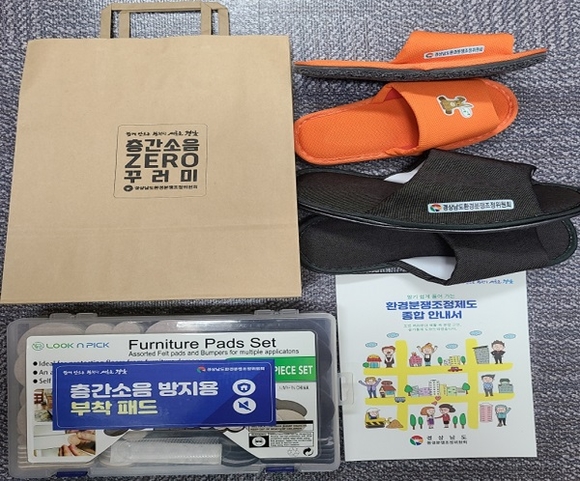 갈등의 원활한 해결을 위해 제공하는 층간소음 ZERO 꾸러미는 층간소음의 주요 원인인 발걸음 소리와 가구 끄는 소리를 줄이기 위한 '층간소음 저감 슬리퍼'와 '층간소음 방지용 부착 패드', 인포그래픽 디자인을 활용해 이해도를 높인 '환경분쟁조정제도 종합 안내서'로 구성된다.