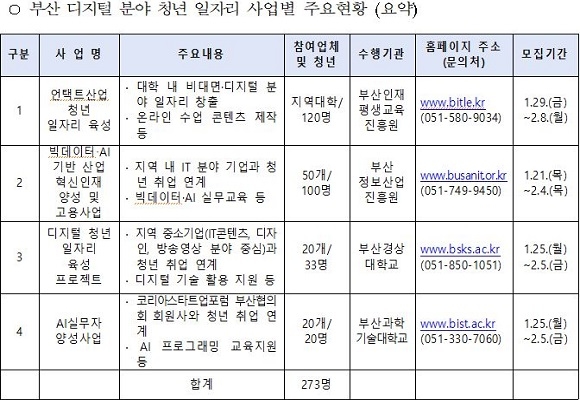 또 디지털 청년 일자리 육성 프로젝트는 부산 내 IT 콘텐츠, 디자인, 방송영상 관련 중소기업의 디지털 업무 분야에 청년 실무 경험을 제공하는 사업이다. AI 실무자 양성사업은 AI 관련 스타트업에 청년들의 일자리를 창출하는 사업이다.