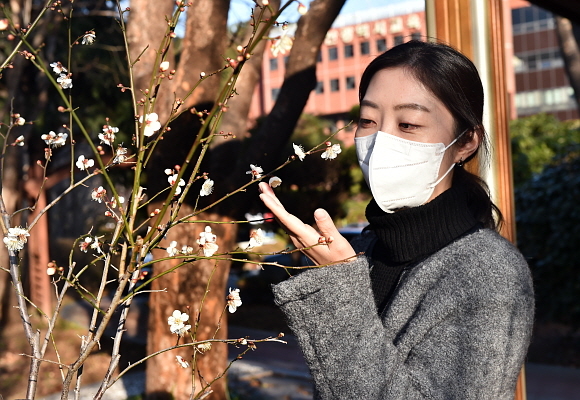 입춘을 일주일 앞둔 27일, 부산시교육청 내 정원에 매화가 꽃망울을 터뜨린 가운데 시교육청 직원이 매화를 어루만지고 있다. 부산시교육청 직원은 “매화는 봄이 머지않았음을 알려주는 전령사다”라며 “코로나19 사태로 고통받은 우리들의 얼굴에도 하루빨리 웃음꽃이 활짝 피어나길 기대해 본다”고 소망을 전했다. (사진=부산시교육청 제공)