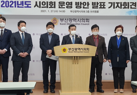 부산시의회 의장단이 27일 오후 2시경 부산시의회 브리핑실에서 신년 기자회견을 열고 올해 의회 운영방안에 대해 발표했다.
