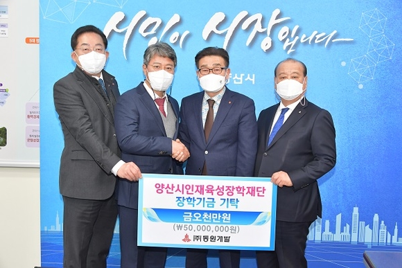 ㈜동원개발은 27일 양산시를 방문해 김일권 양산시장과 임재춘 장학재단 이사장 등이 참석한 가운데 장학기금 기탁식을 가졌다.