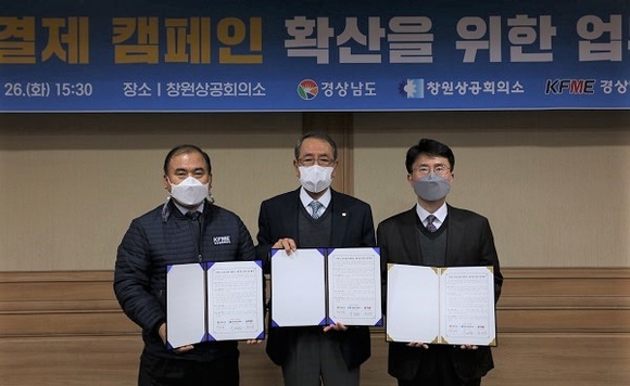 창원상공회의소가 경남도, 경남소상공인연합회와 26일 창원상의 3층 의원회의실에서 '착한 선결제 캠페인 확산을 위한 업무협약'을 체결했다.