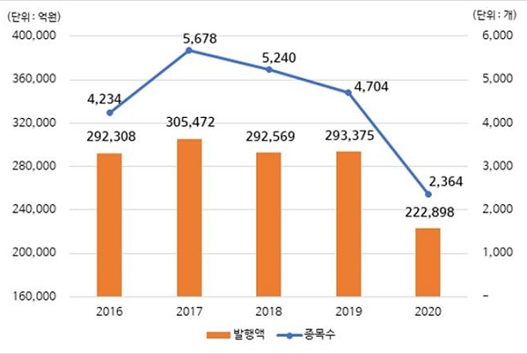 발행형태별로는 사모발행이 15조 6080억원으로 전체 발행금액의 70.0%를 차지했다. 또 공모발행은 나머지 30.0% 비중인 6조 6818억원인 것으로 집계됐다.