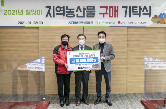 이날 기탁식은 민족 대표명절인 설을 앞두고 남동발전이 진주원예농협을 통해 1000만원 상당의 지역농산물을 구매해 코로나19의 장기화로 침체한 지역 경제에 활력을 불어넣고, 지역의 어려운 이웃이 풍요롭고 따뜻한 명절을 지내도록 차례용 농산물을 지원하기 위해 마련됐다.