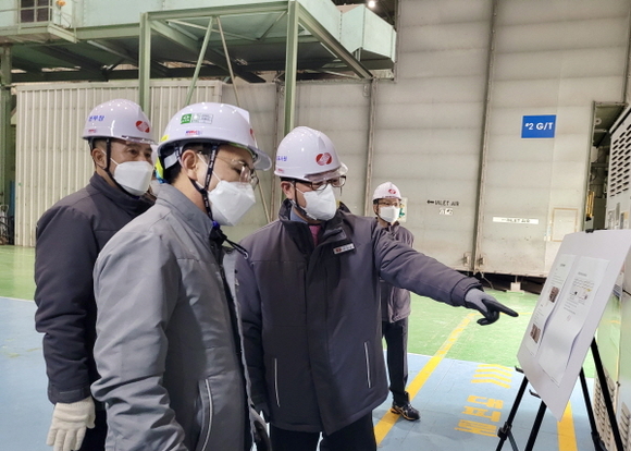 박일준 한국동서발전 사장(오른쪽)과 경영진이 일산발전본부에서 현장 안전점검을 시행하고 있다. (사진=동서발전 제공)