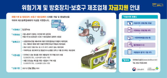 연구개발자금(소요비용의 60% 이내)과 시험장비구매자금(소요비용의 50% 이내)을 각각 최대 5000만 원까지 지원하며, 지원대상은 유해·위험기계 및 방호장치·보호구 제조업체로 등록한 업체다.