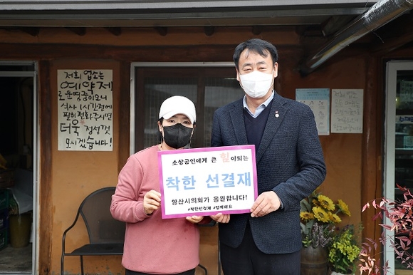 양산시의회 임정섭 의장이 '착한 선결제 캠페인'에 동참하며 코로나19로 사회적 거리두기에 영업제한을 받은 피해 소상공인 지원에 나섰다.