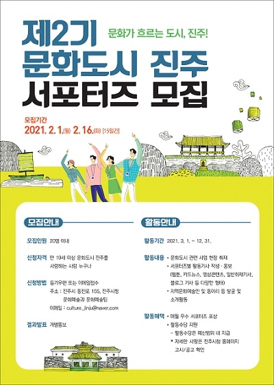 경남 진주시가 오는 16일까지 제2기 문화도시 진주 서포터즈를 공개 모집한다.