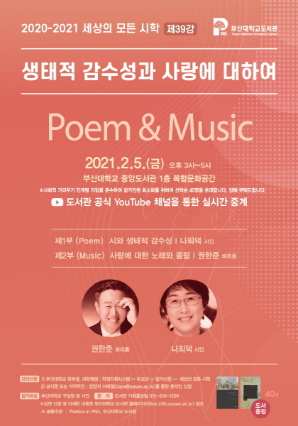이날 행사는 시인 나희덕과 바리톤 권한준이 강연과 공연을 맡아 코로나19로 위로가 필요한 우리 이웃과 시민에게 공감과 힐링의 시간을 제공할 전망이다. 행사는 온·오프라인으로 병행되며, 코로나19 확산 방지를 위해 현장 참석자를 선착순 40명으로 최소화해 모집했다. 현장 강연은 유튜브 ‘부산대학교 도서관’ 공식 채널을 통해 중계한다.