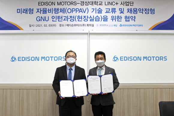 국립 경상대학교(GNU) 링크플러스(LINC+)사업단과 전기상용차 전문기업인 에디슨모터스(주)는 지난 3일 오후 에디슨모터스(주) 회의실에서 미래형 자율비행체(OPPAV) 기술교류, 채용약정형 인턴과정 운영과 신규채용을 위한 긴밀한 산학협력 협약을 체결했다.