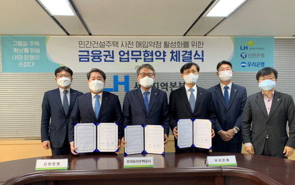 한국토지주택공사(이하 LH)는 지난 8일 서울시 강남구 소재 LH 서울지역본부에서 ‘민간건설주택 매입약정방식’ 사업의 안정적인 수행 및 활성화를 위해 신한은행, 우리은행과 업무 협약을 체결했다.