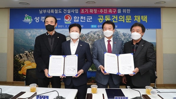 경남 합천군과 경북 성주군이 9일 성주군청에서 남부내륙철도 건설사업 조기 확정·추진을 촉구하는 공동건의문을 채택했다.
