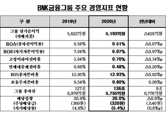 한편 BNK금융그룹 이사회에서는 1주당 320원의 현금배당을 결의했다. 금융위원회의 권고안을 참고해 배당 성향은 20%로 정했으며 시가 배당률은 5.4%로 공시했다.