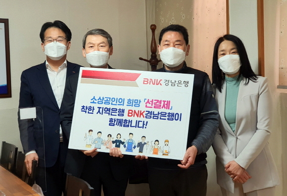 BNK경남은행은 지역 경제 활성화를 위해 ‘착한 선(先)결제 캠페인’에 동참하고 있다고 10일 밝혔다. 이날 고객지원그룹 김영원 그룹장은 직원들과 함께 창원시 마산합포구 신포동 인근 음식점을 찾아 선결제했다.